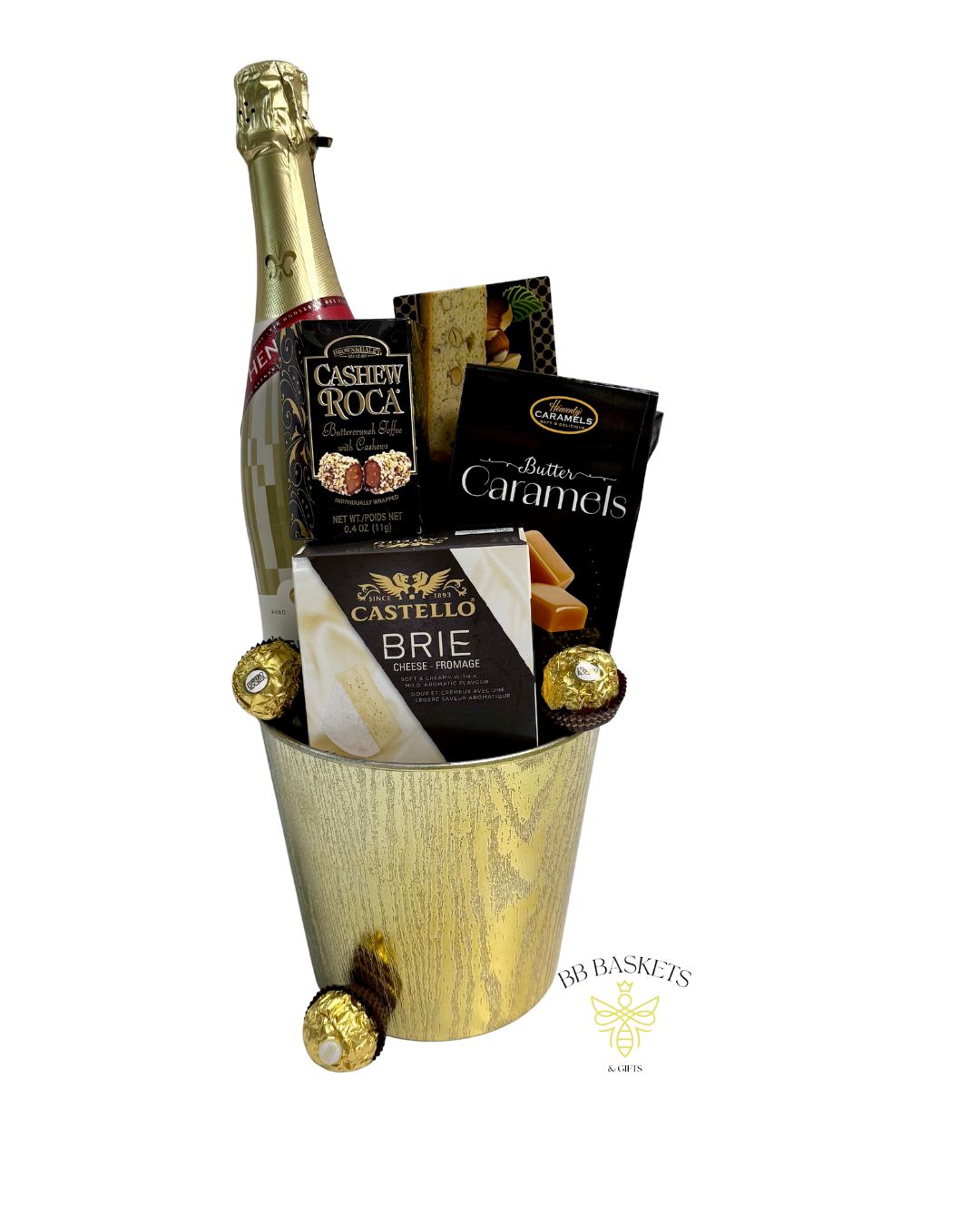 Delight in an elegant celebration-ready assortment featuring sparkling wine and gourmet indulgences, beautifully presented in a gold bucket. Thoughtfully curated to elevate birthdays, anniversaries, milestones, or corporate celebrations, this refined gift delivers a perfect balance of sweet, savory, and sparkle. Whether shared with loved ones, clients, or colleagues, it’s a timeless way to toast any occasion.