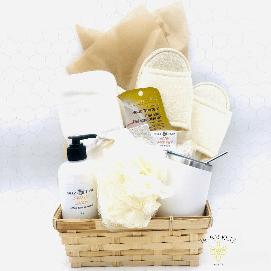 Make them feel like one in a million with this luxurious home spa gift. Our Luxe basket is filled with a soothing face mask, locally made bath salts, local tea-infused energy lotion, slippers, a plush blanket, a pumice stone, and a stainless-steel wine tumbler. The perfect spa essentials to relax and unwind with.